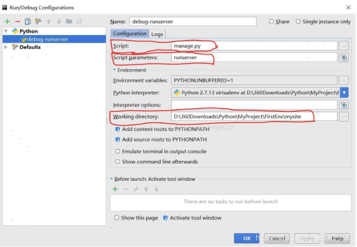 注意:1)只在本地运行时,Script parameters 运行的路径可以为默认localhost即可,如runserver 或runserver 127.0.0.1:8000
